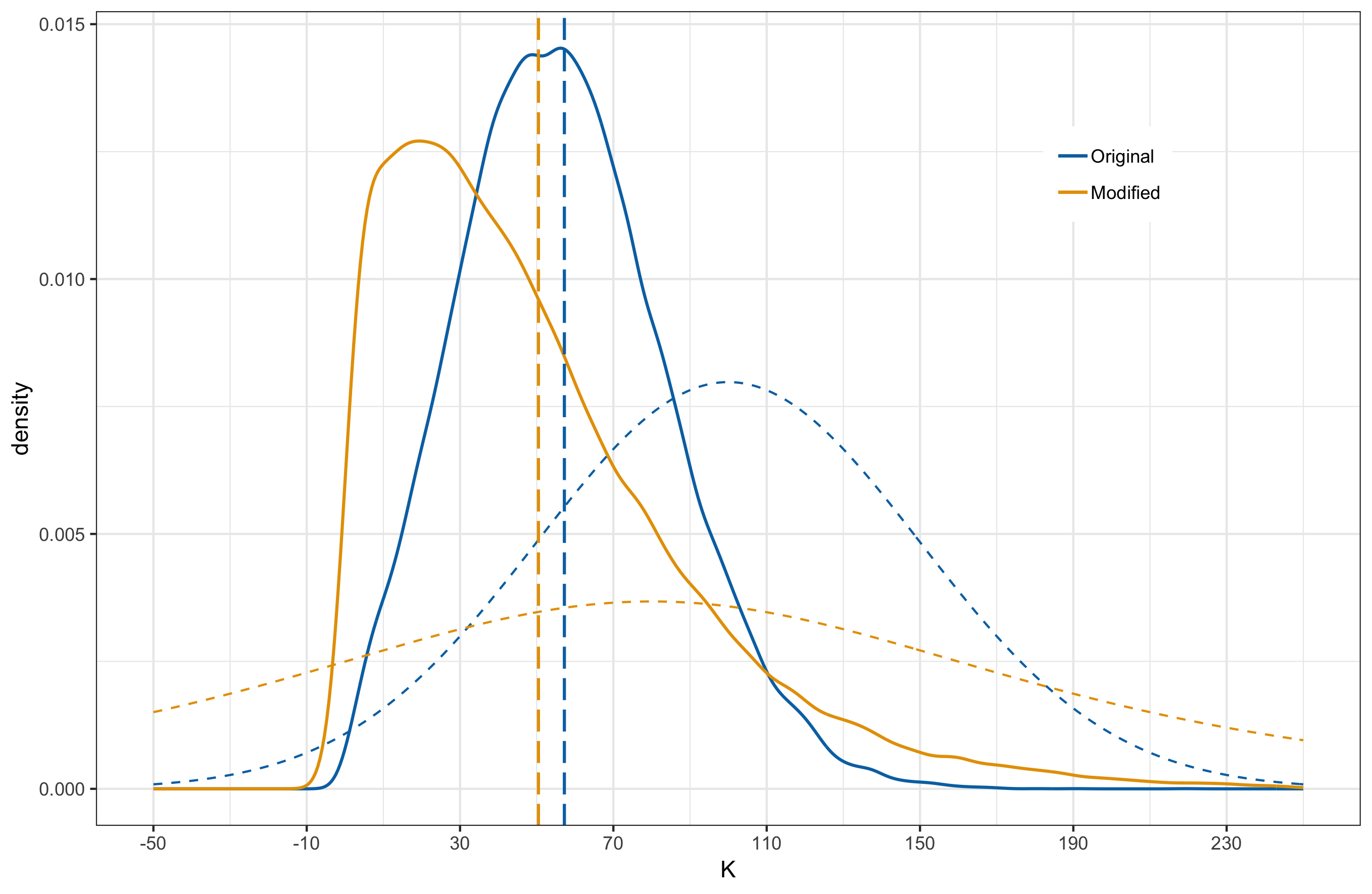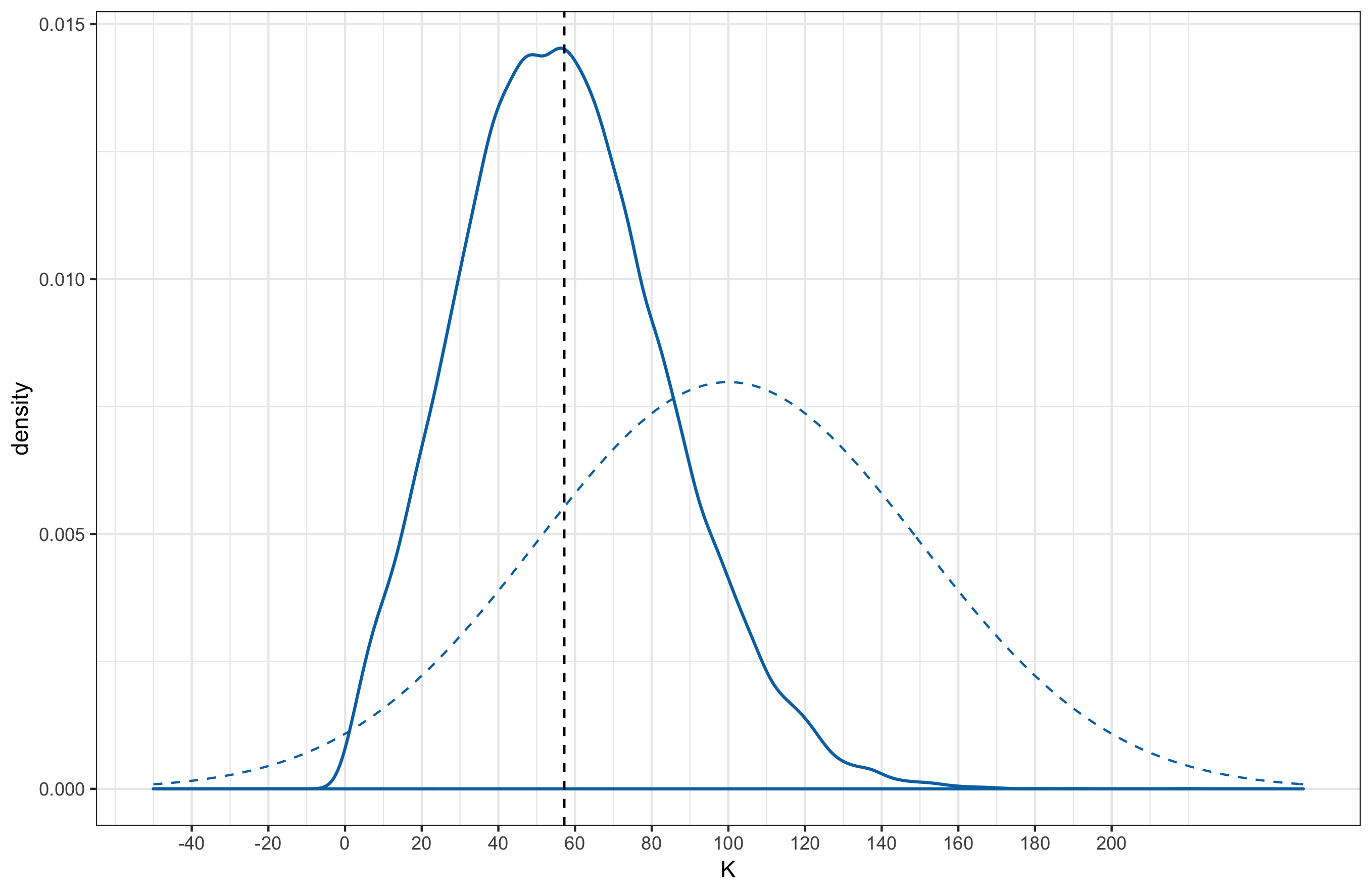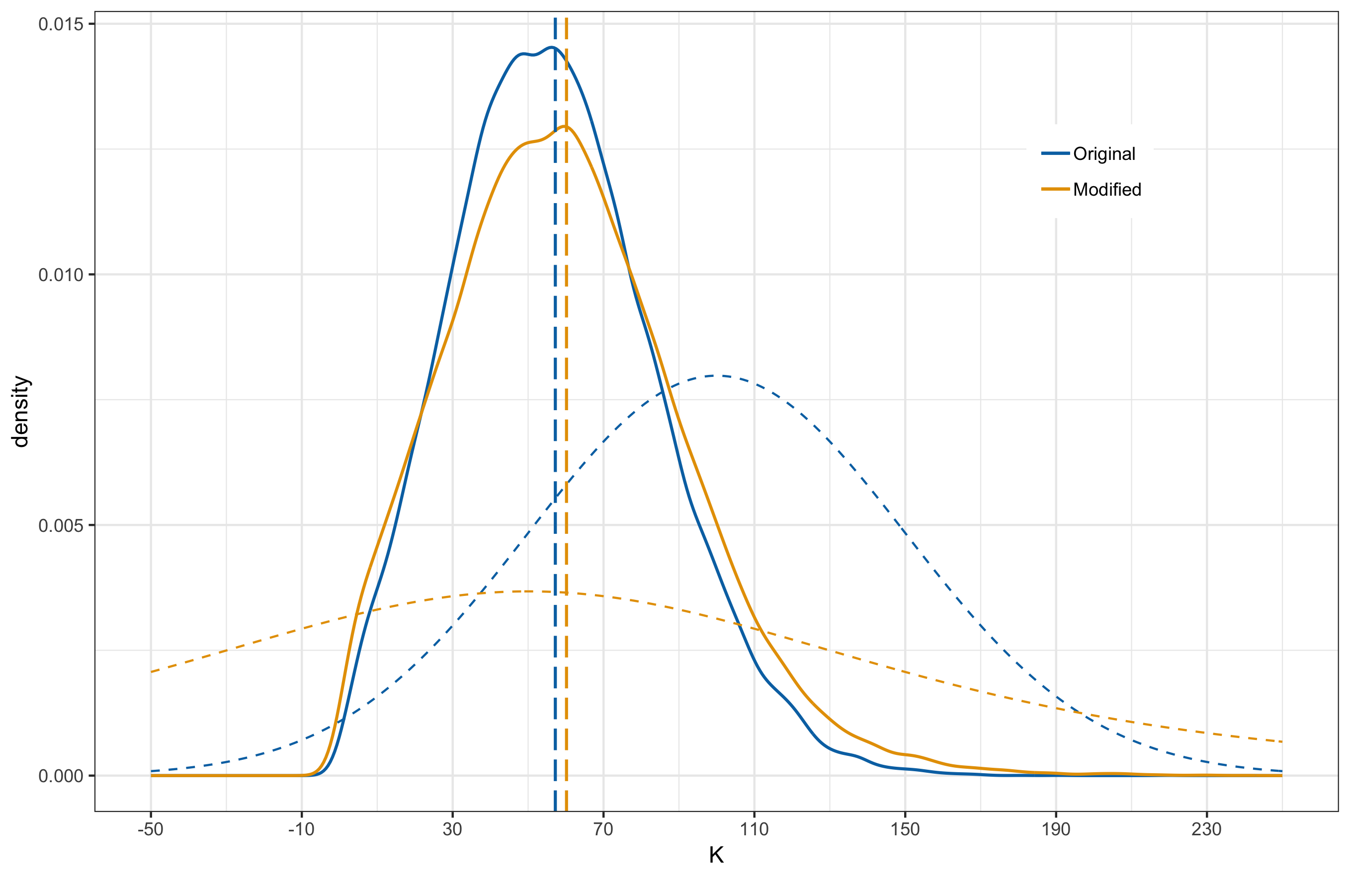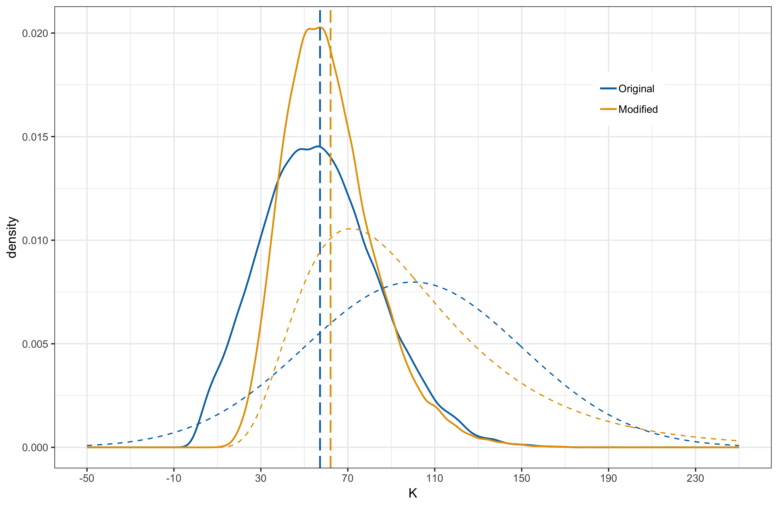 In all cases, the posterior means remain close to each other. When comparing the distribution shapes, case 2 results in the least shift from the original posterior. Most noticeable shift occurs in case 3 where we have shifted the mean in the prior and made the tails heavier. This is something to be a bit weary about. Also of interest is the fact that even under case 3, where the modified prior for $K$ has significant probability mass to the left of 0, the posterior does not have probability mass over negative $K$ values. In other words, model is indicating that negative $K$ values are strongly inconsistent with the observed data.