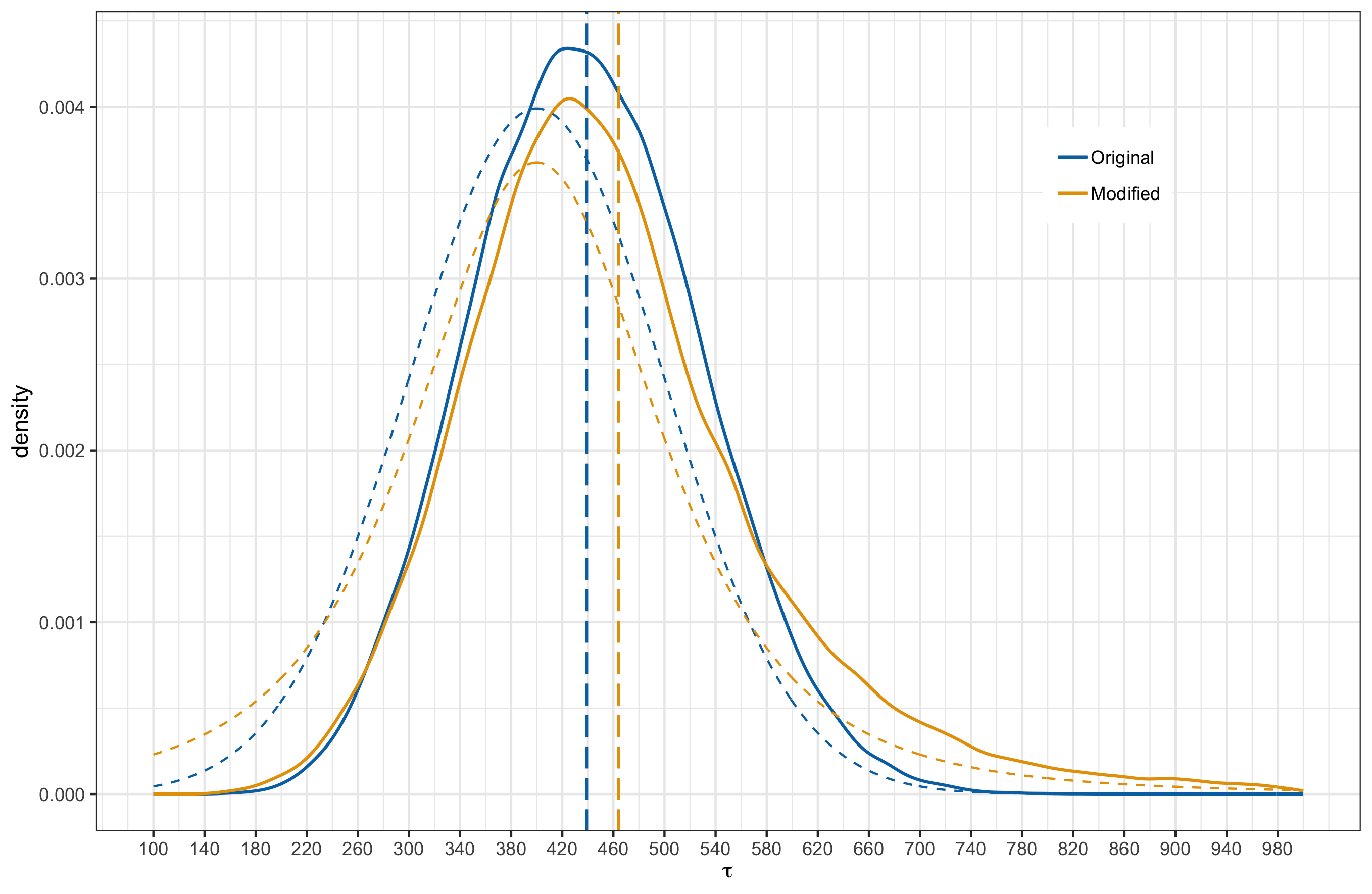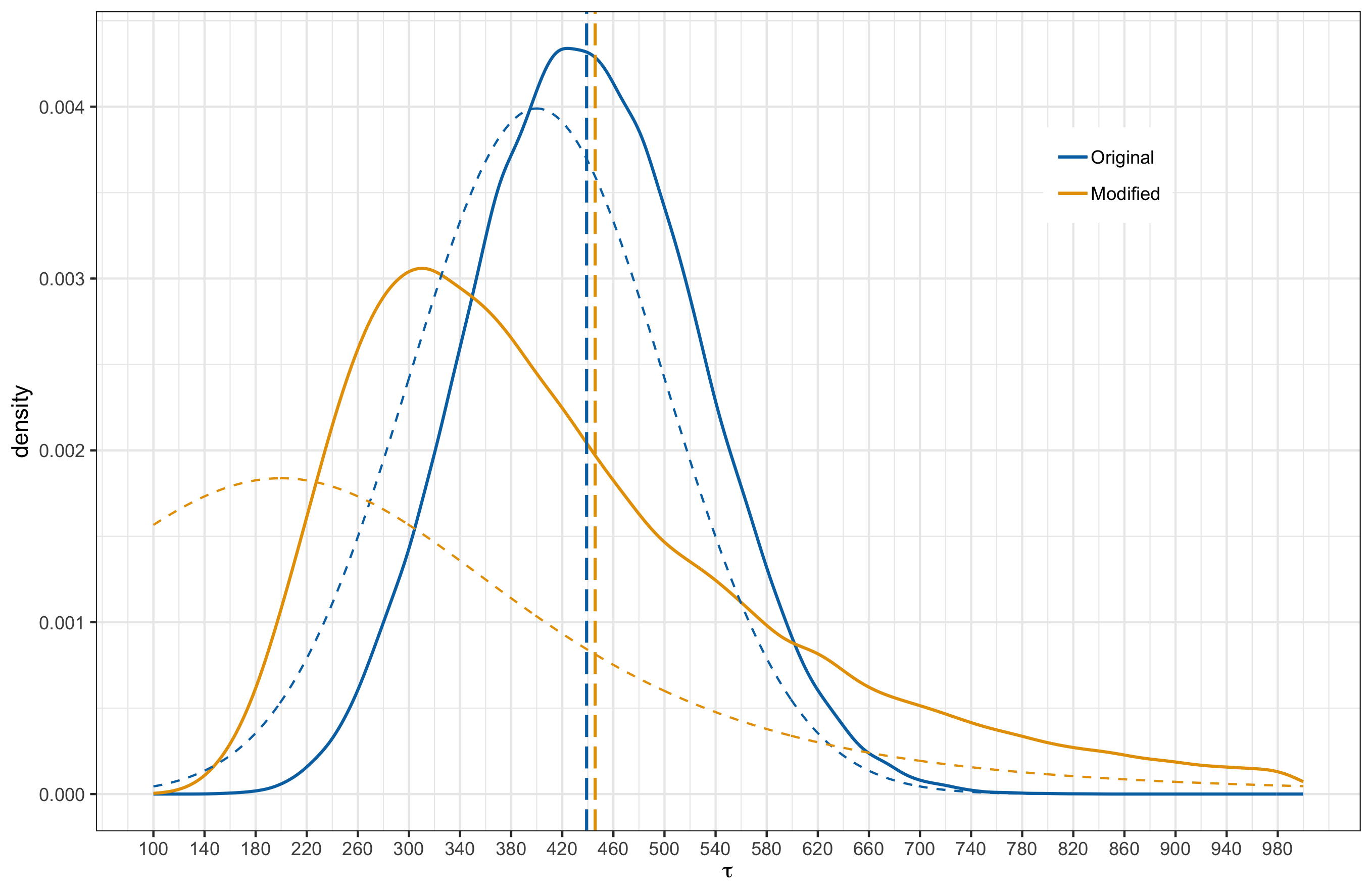 Below, I provide plots comparing the original and new posterior induced by the alternative priors. I have overlayed the prior distributions as dashed curves and the vertical lines mark the posterior means.