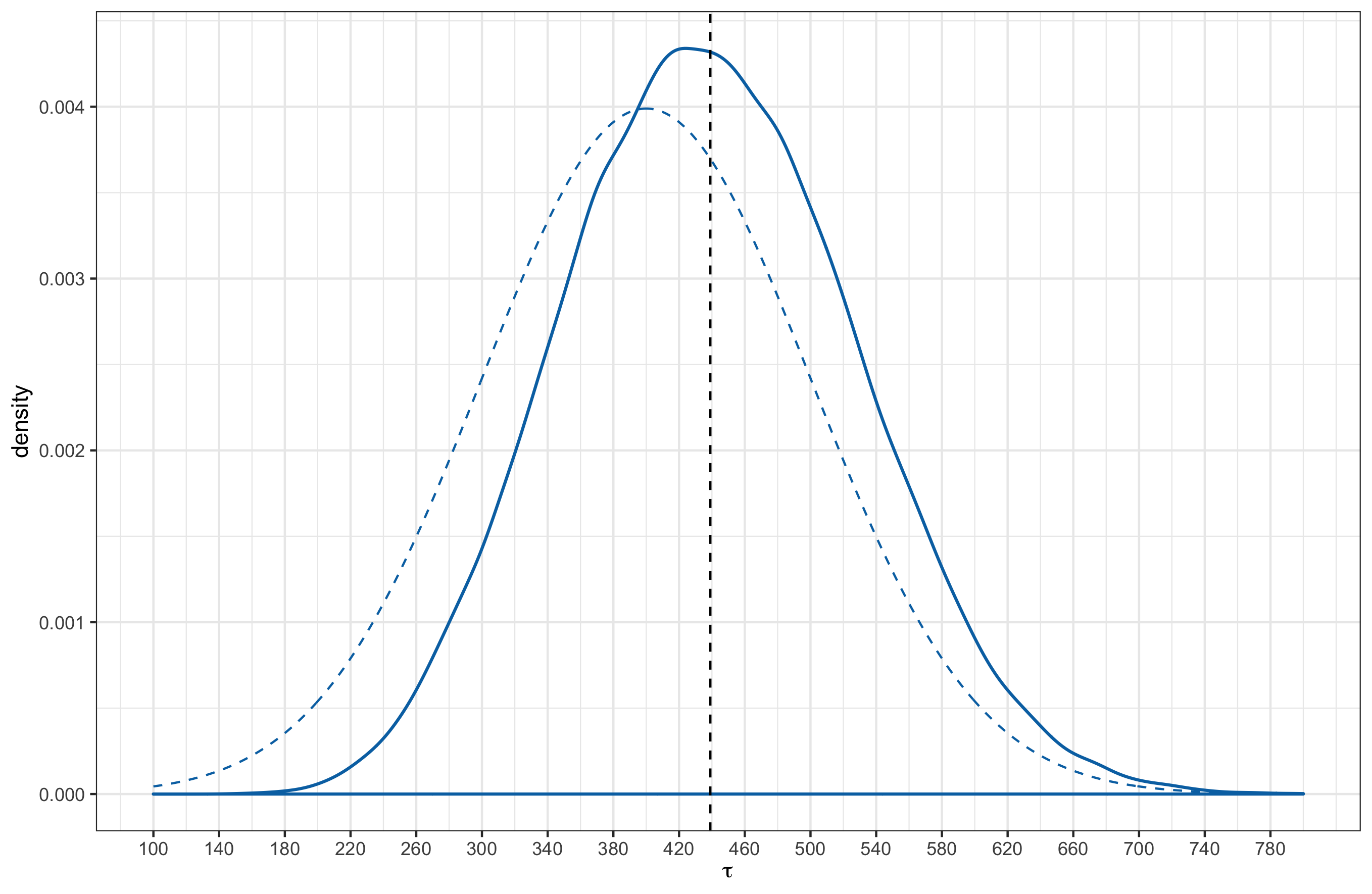 where $\mathcal{N}(\mu,\sigma^2)$ denotes a Normal distribution with mean $\mu$ and standard deviation $\sigma$. To understand why the above prior choices are weakly informative, notice that $K$ could take a value in the range of 0 to 300 with approximately 95% probability, easily covering the typical $K$ values used in sports. Similarly, the approximate 95% interval for $\tau$ is (200,600).
