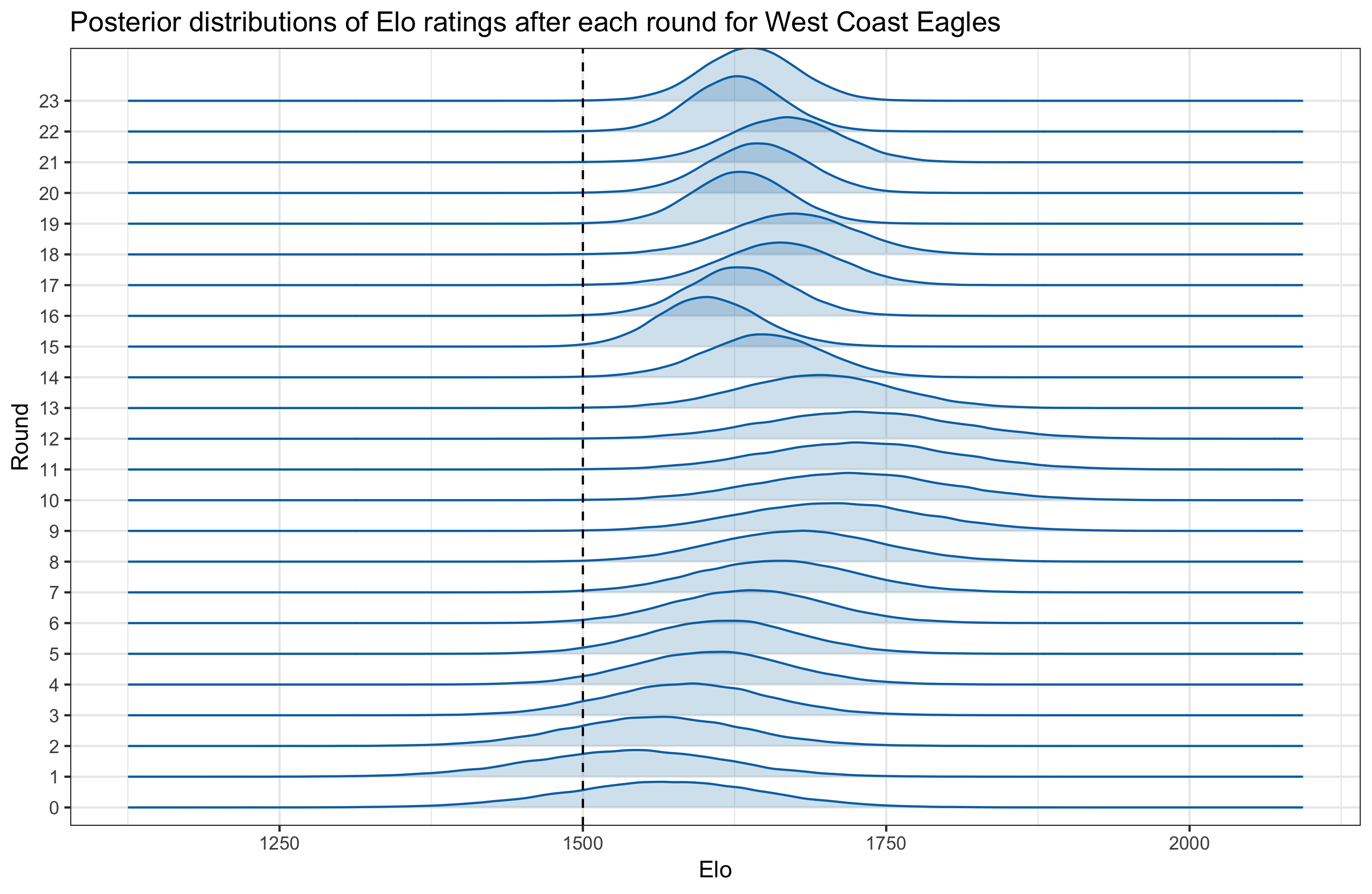 In Part 1 of this three-part series, I presented an introduction to the Elo rating system. In this post, I describe the specifics of the Bayesian model used to infer the Elo parameters $K$ and $\tau$. I also illustrate how the parameter uncertainty is reflected in Elo ratings by showing the posterior distribution of the ratings for two teams (St. Kilda and West Coast Eagles) as the season progressed. Instead of a single point estimate for a team’s Elo rating, we can get a more informative view by looking at plausible values of Elo expressed as a probability distribution. This is a precursor for the final piece of the puzzle, covered in the Part 3, where I estimate the win probabilities for future matches, including the Premiership title. The source code for this work can be found here.