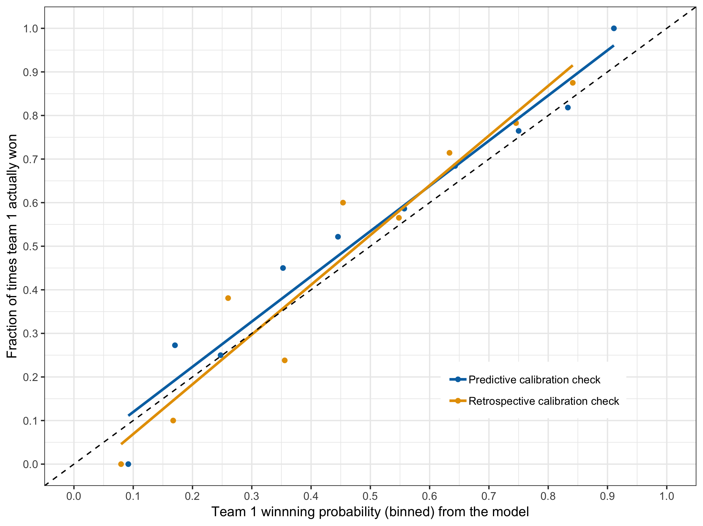 One of the most desirable properties of a model is to have well calibrated probabilities. If I have to pick one metric to evaluate a model, it would definitely be the calibration check. What I mean by well calibrated probabilities is, for example, if the model predicts a team wins with 80% probability, then of all the times such predictions are made, the team should win approximately 80% of the time. This should hold not just for 80%, but for all probabilities.